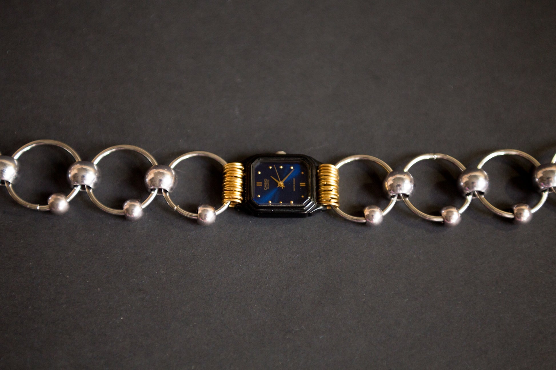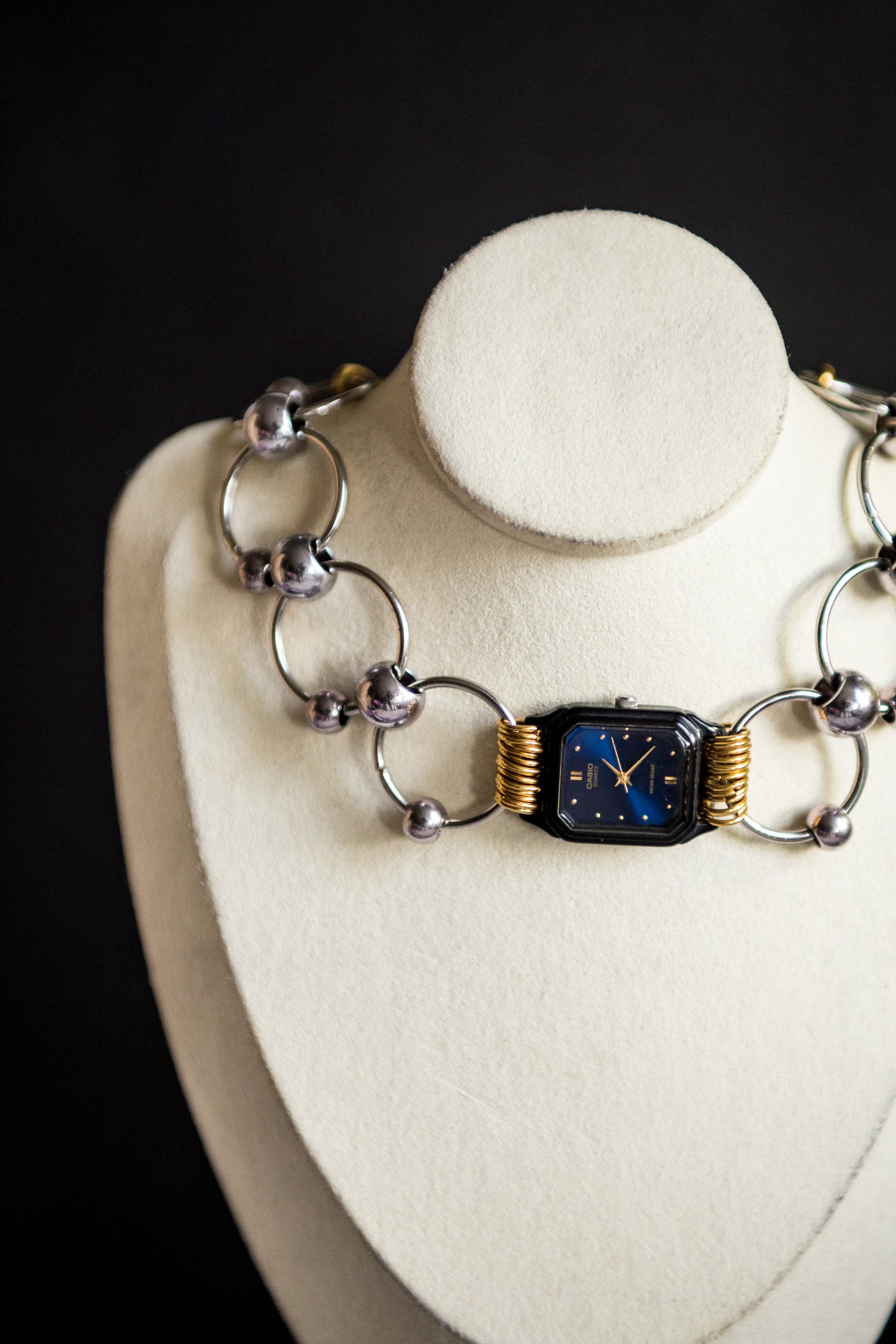 Collier ras du coup, ancien cadran de montre Casio vintage (non fonctionnel) , anneaux en acier inoxydable argenté avec perles en acier argenté. Anneaux de jonction en acier inoxydable doré