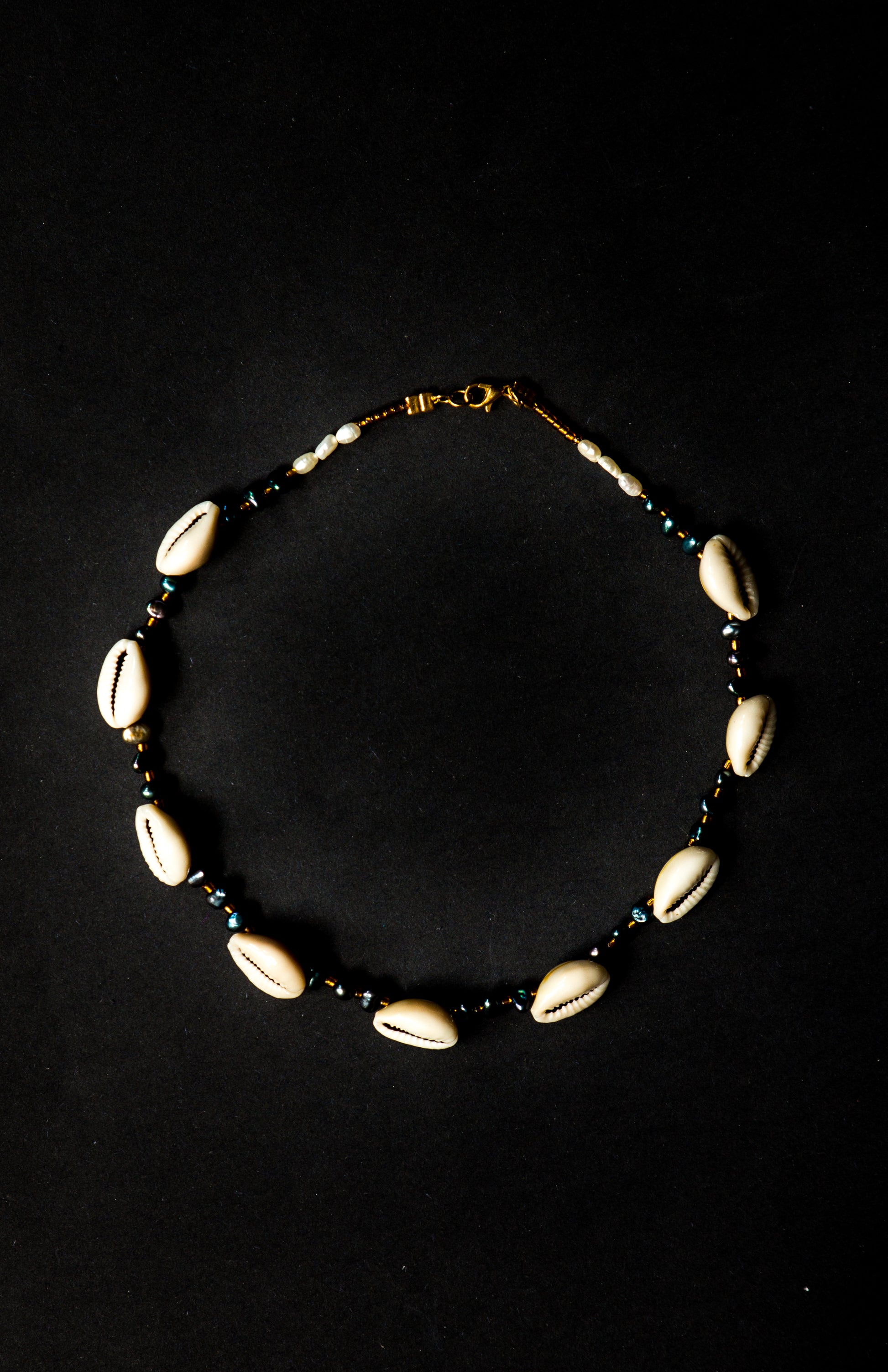 Chocker ras de cou coquillage cauri, perles de nacre naturelles aux reflets bleutés, perles de rocaille dorées