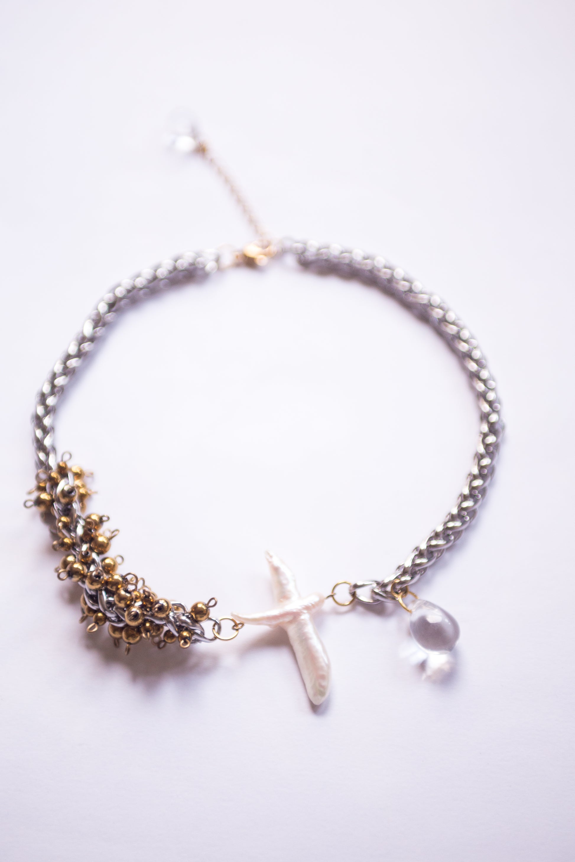 Ras de cou réglable en acier inoxydable doré et et argent, chaine palmier, croix en nacre et goute de verre