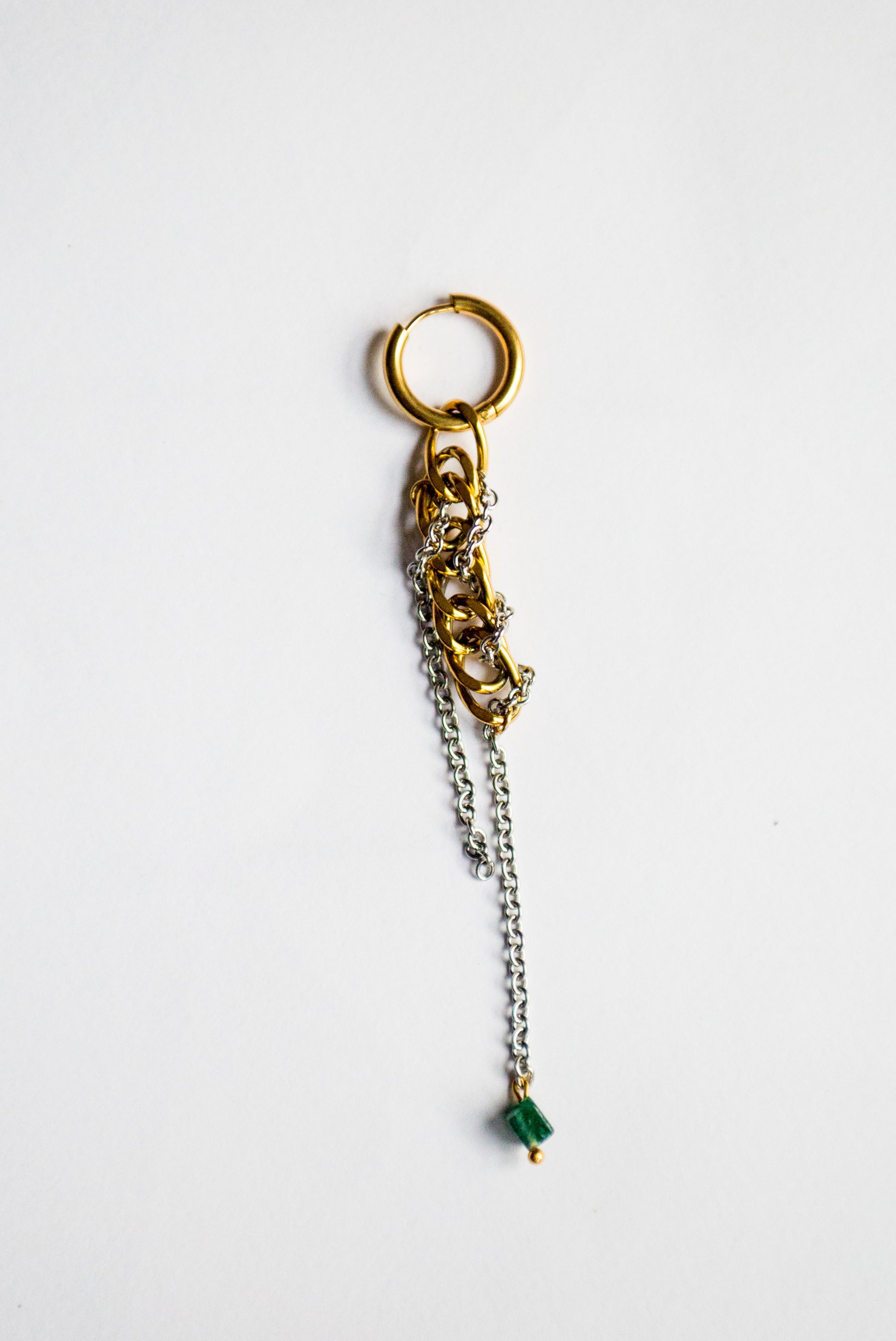 Mono boucle en acier inoxydable dorée et argenté, chaine entremêlées, pierre verte naturelle